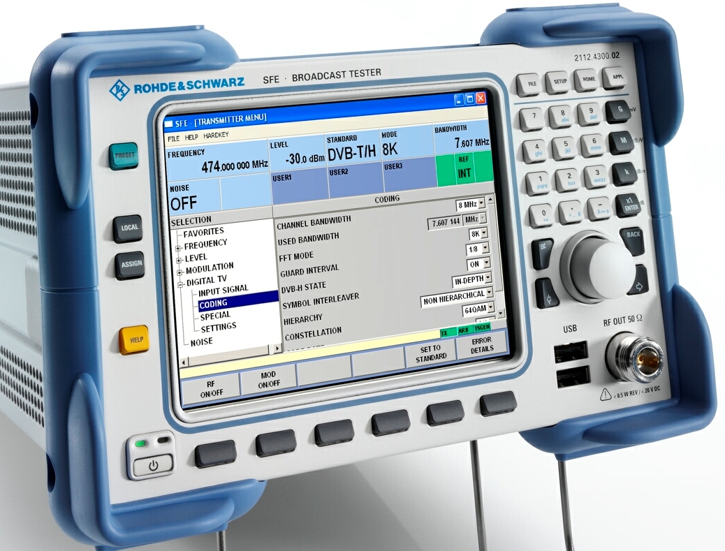 Il compatto generatore di segnali televisivi multistandard Rohde & Schwarz SFE, in formato mezzo rack da 19 pollici, contiene infatti un modulatore che integra un codificatore in tempo reale, una sorgente di segnale in banda base e un simulatore di canale a 12 cammini.