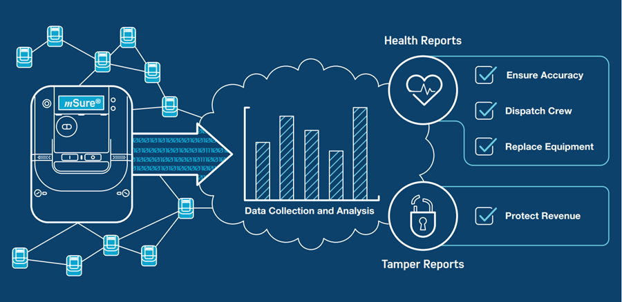 I dati grezzi, generati dai contatori abilitati con tecnologia mSure, vengono forniti ed elaborati da un servizio di analisi basato su cloud, consentendo alle utility di eseguire report sull'intera parco contatori a intervalli desiderati.