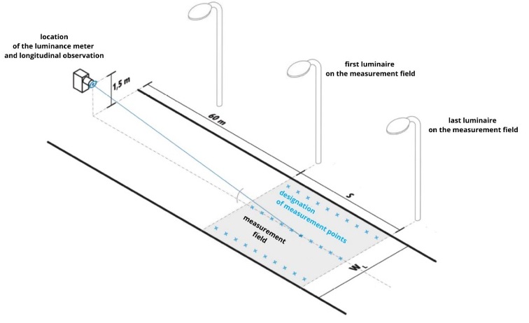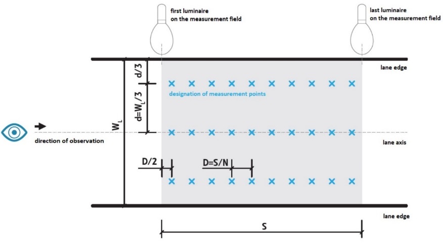 La figura fornisce indicazioni generali sul metodo di determinazione del campo di misura. A seconda della classe illuminotecnica adottata nella progettazione e della tipologia degli apparecchi scelti e dell'altezza del palo, la distanza misurata tra i pali può variare da qualche metro a qualche decina di metri. Pertanto, la dimensione del campo di misura deve essere specificata in fase di progetto e verificata in opera, in quanto la distribuzione effettiva delle colonne può differire da quella pianificata, il che influisce sui risultati della misura.