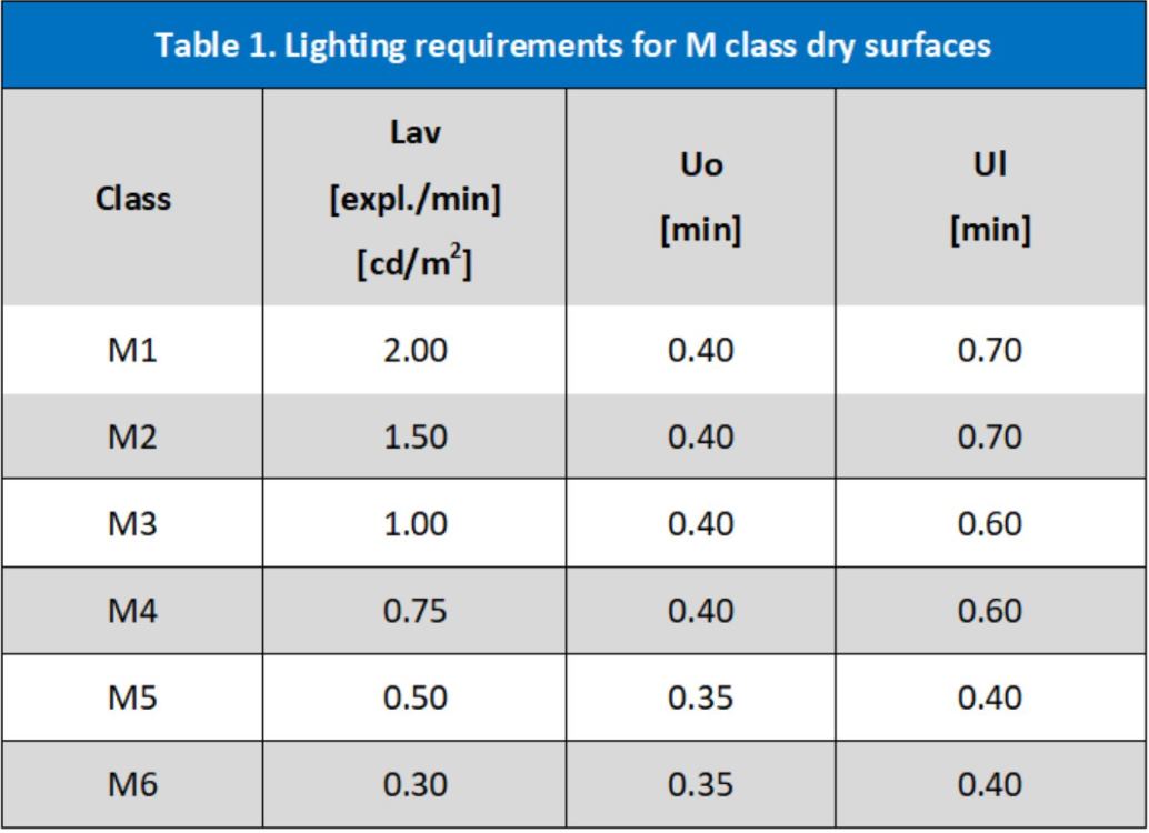 La tabella 1 mostra i requisiti minimi di luminanza per la classe di illuminazione M.