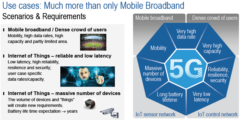 Inoltre, il 5G supporterà anche tecnologie dove bassa latenza e affidabilità della trasmissione saranno di ordini di grandezza superiori a quanto mai fatto con le reti mobili, ad esempio per supportare la guida automatica e la gestione del traffico veicolare in tempo reale, dove tempi di risposta e integrità delle informazioni sono caratteristiche indispensabili.