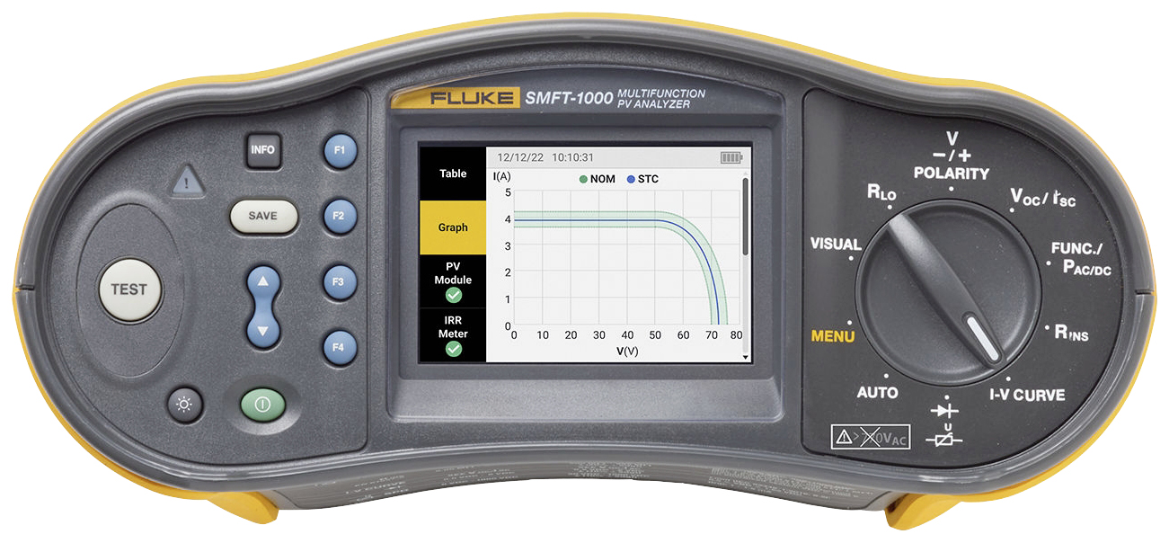Un’altra caratteristica importantissima per i tecnici è il display a colori, di dimensioni compatte ma ad risoluzione, che permette di mostrare in modo ben leggibile in qualunque condizione di illuminazione i risultati delle misure e le impostazioni dello strumento. Inoltre, l’esaustivo sistema di help riporta del display tutte le informazioni utili a guidare i tecnici, soprattutto quelli che operano saltuariamente sugli impianti fotovoltaici, a eseguire correttamente i collegamenti e le procedure di test.Misura della caratteristica I-V dei pannelli fotovoltaiciInfine, una caratteristica peculiare è quello di poter ottenere e tracciare le curve IV di stringhe o pannelli in tempo reale, ottenendo immediatamente un’indicazione di tipo Pass/Fail quando ancora si è sull’impianto. Valutare se le prestazioni sono corrette è semplicissimo grazie al misuratore di irraggiamento che si collega automaticamente allo strumento SMFT-1000 via Bluetooth, dando la possibilità di correlare in tempo reale le prestazioni dell’impianto in base alle condizioni ambientali.