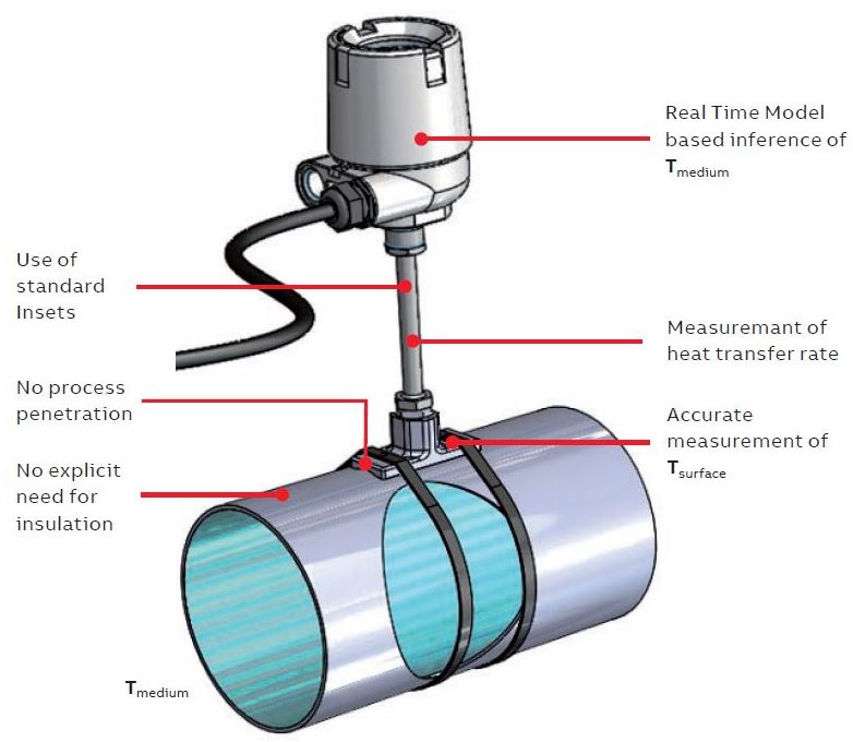 La soluzione tecnologicamente avanzata sviluppata da ABB, che semplicemente viene 'abbracciata' alla conduttura, prevede una doppia sonda di temperatura, che serve a rilevare la temperatura in superficie e la temperatura ambiente, per poi ricavare la temperatura del fluido applicando un particolare modello matematico.