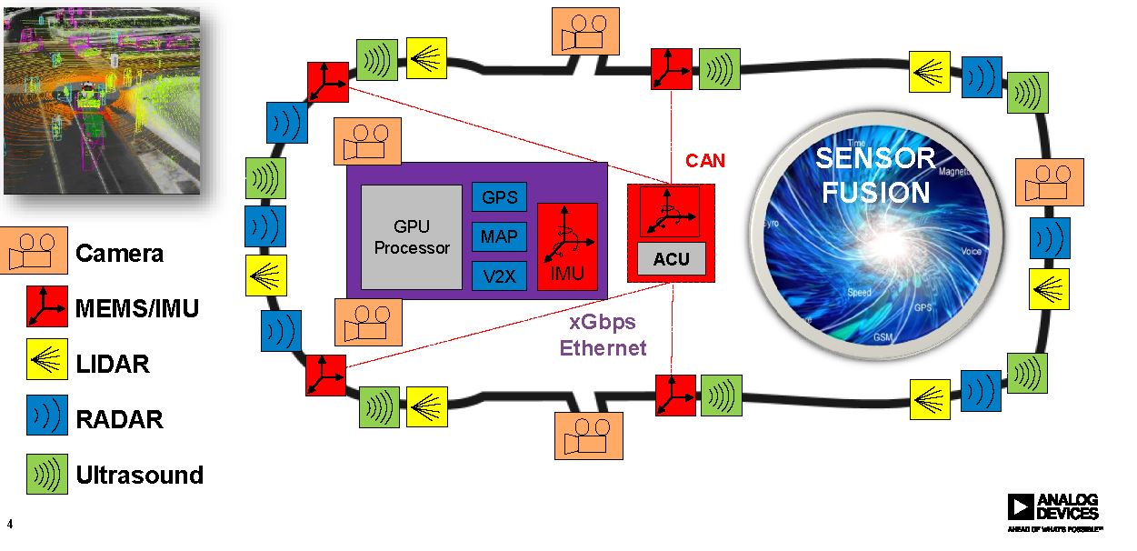 Tuttavia, come ben spiega Chris Jacobs, Vice President responsabile della Autonomous Transportation & Safety Business Unit di Analog Devices: “Il radar da solo non basterà e la chiave di volta sarà la capacità di fusione sensoriale, ovvero l’abbinamento intelligente di informazioni raccolte da diverse tipologie di sensori: radar, lidar, telecamere, accelerometri, odometri e così via.”