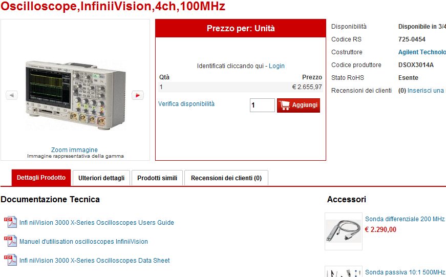 Volevamo comprare un oscilloscopio da 100 MHz a 4 canali e una volta trovato il modello consono alle nostre esigenze lo volevamo avere domani sul nostro banco di misura – come al solito le scadenze incombono – e sapendo che la logistica e l'affidabilità delle consegne sono uno dei fiori all'occhiello di RS, questo specifico aspetto non ci preoccupava.