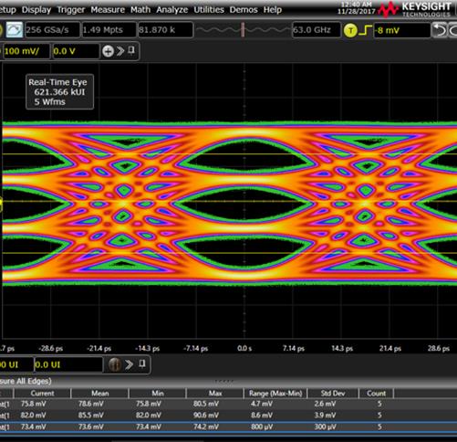 Nel nostro modello più potente di oscilloscopio UXR, che servirà ai clienti per progettare e validare i loro sistemi e componenti di ultime generazione, si possono acquisire quattro canali contemporaneamente con una larghezza di banda di 256Gs/s, oppure vedere chiaramente fronti di salita e discesa di qualche picosecondo, garantendo un livello di rumore di soli 210 µVrrms.