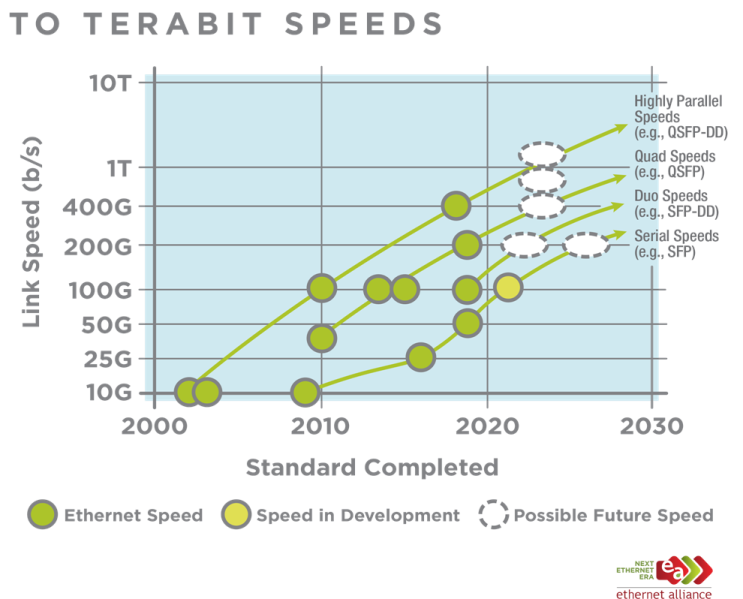 L’evoluzione tecnologica degli standard basati su Ethernet è stata impressionante, paragonabile a quella delle microelettronica. Dai 10 Mb/s tipici degli anni ’80 si è passati alle centinaia di Gb/s di cui si discute oggi, mentre già si preparano le prime ipotesi per la futura evoluzione al Tbit/s.