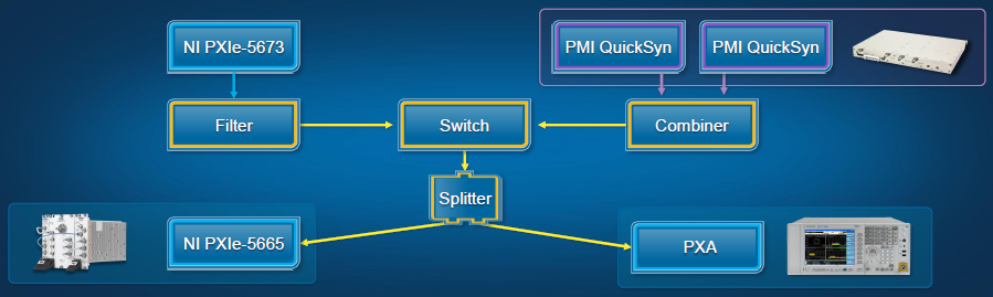 Per le prove sui segnali radiomobili la sorgente era un generatore di segnali vettoriali NI PXIe-5673 inserito nello stesso cestelli PXI che ospitava la strumento di National Instruments. Per la prova di linearità, i due toni che costituivano il segnale di ingresso erano generati da due sintetizzatori di frequenza a microonde di Phase Matrix (società di recente acquisita da National Instruments).