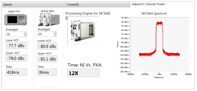 La demo presentata a NIWeek ha messo a confronto prestazioni e velocità del nuovo analizzatore di segnali PXIe-5665 VSA di National Instrument con il modello PXA di Agilent effettuando misure di linearità, misura del vettore errore (EVM) su un segnale LTE e misura di potenza nel canale adiacente su un segnale WDCMA.