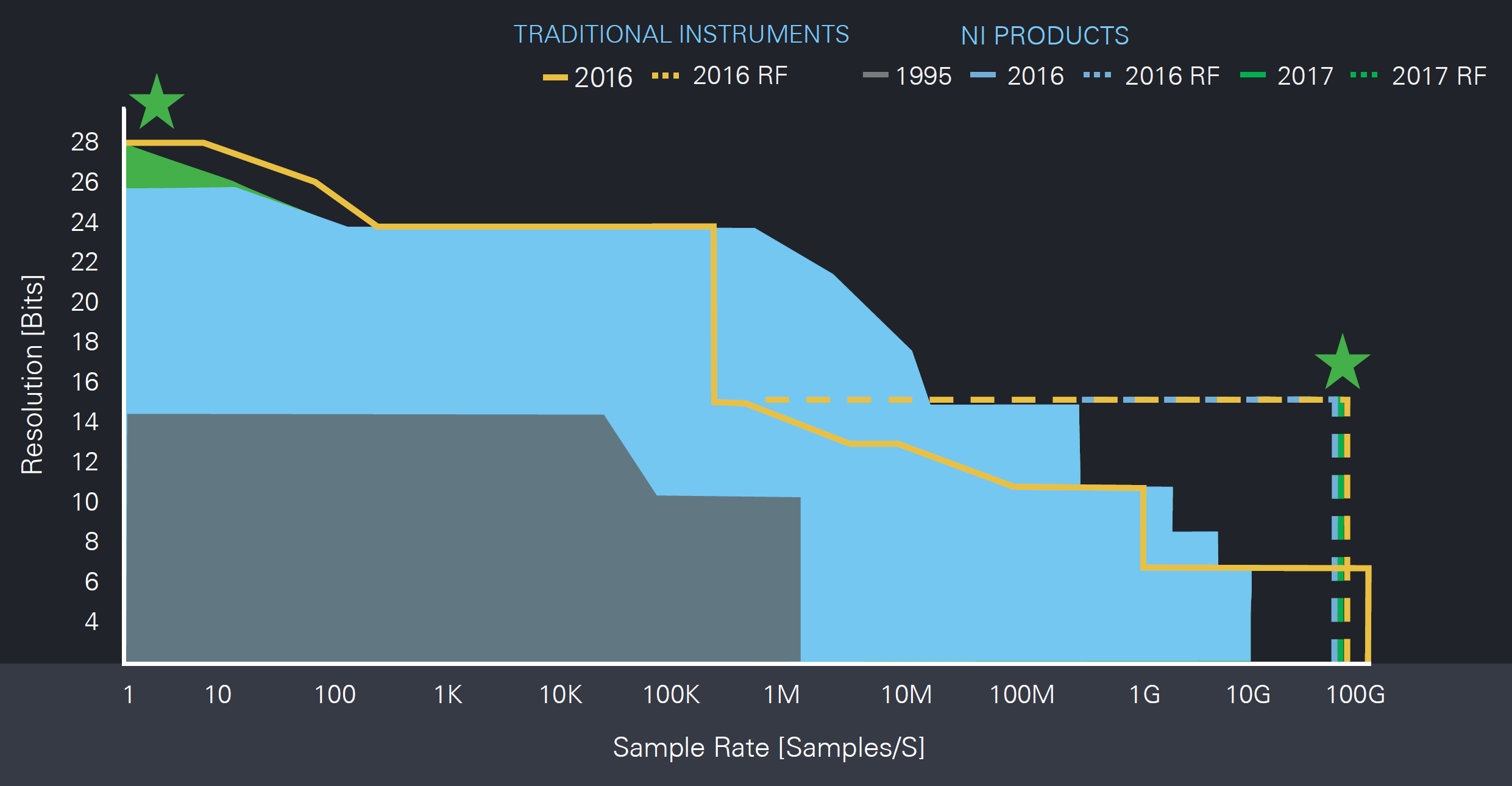 Fa quasi tenerezza ricordare come National Instruments si vantasse nel 1998 di essere riuscita a dimostrare la fattibilità di trasformare un comune PC in un accurato oscilloscopio digitale da 100 MHz o in un analizzatore di spettro da 50 MHz o qualsivoglia altro strumento di misura definito dal software.