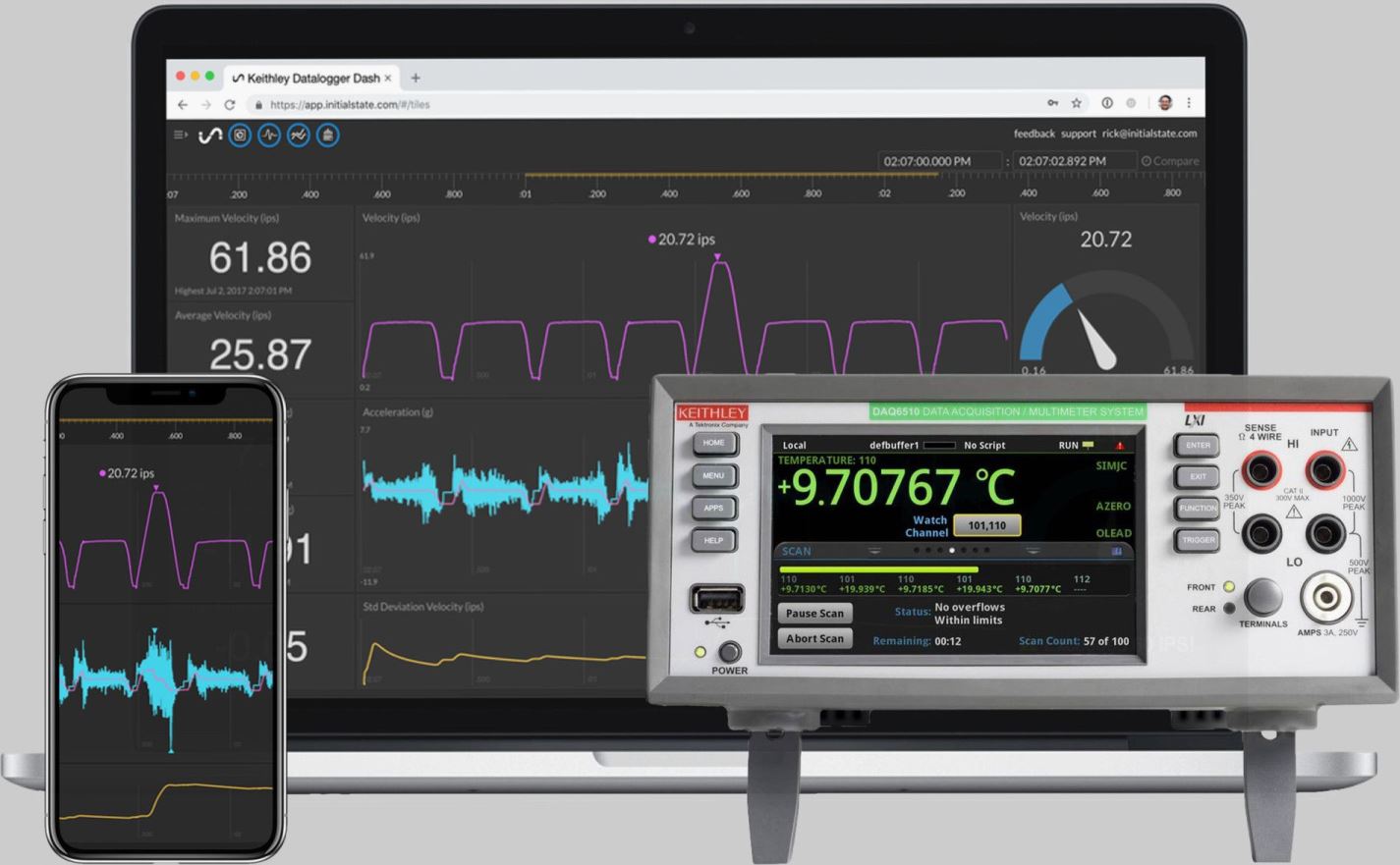 La piattaforma IoT di Initial State, società controllate da Tektronix, è un servizio di raccolta a visualizzazione dei dati accessibile da remoto che consente l'acquisizione delle misure in streaming.