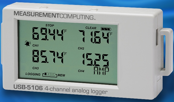 Il data logger USB-5106 di Measurement Computing Corporation è uno strumento economico che permette di registrare e visualizzare sul display LCD fino a 4 valori di tensione, corrente o temperatura.