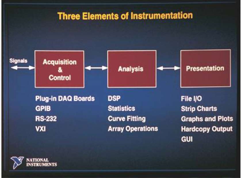 Nel 1988 National Instruments definiva l'acquisizione dati l'arte di acquisire, analizzare e presentare all'utilizzatore finale il significato dei dati reali.