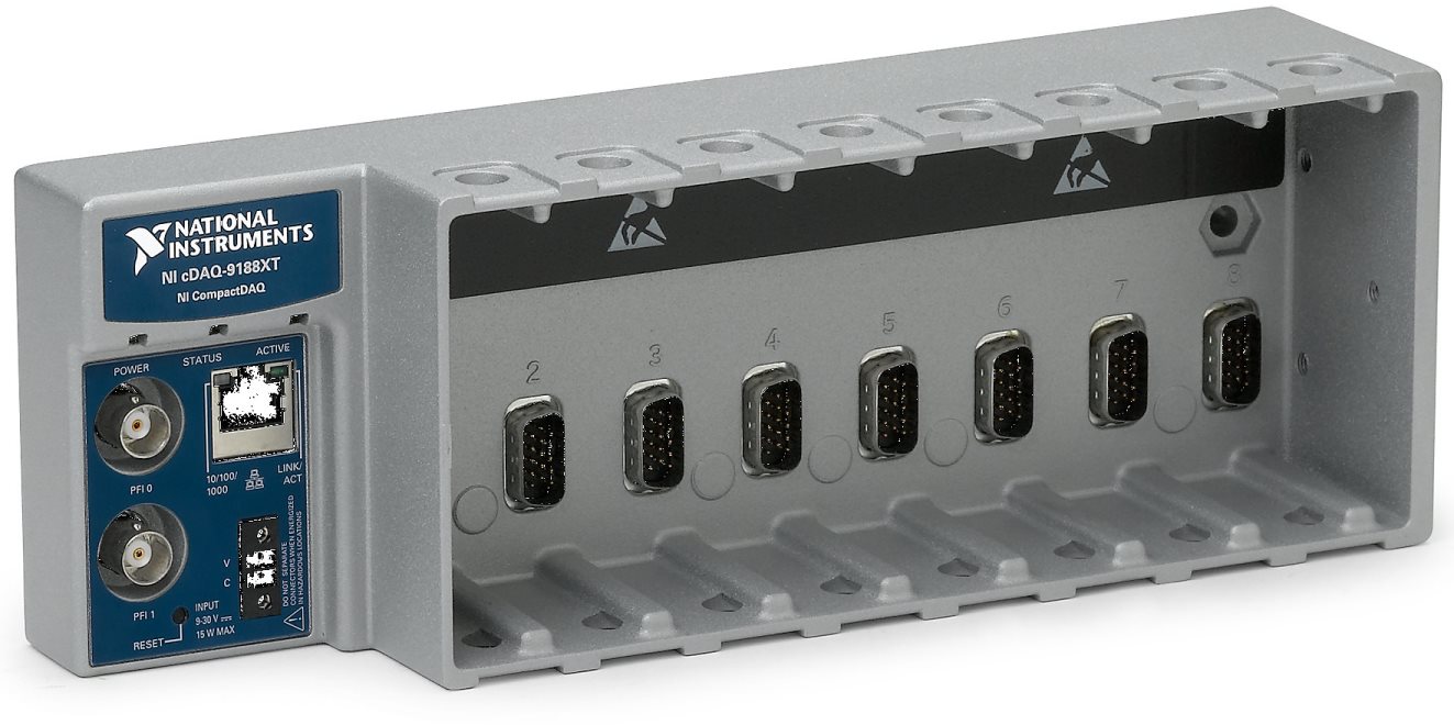 Il nuovo modello di telaio modulare compatto per realizzare sistemi di acquisizione dati compatti cDAQ-9188XT presentato da National Instruments integra il collegamento alla rete Ethernet e dispone di 8 slot che possono ospitare tutti i vari moduli di acquisizione e condizionamento del segnale della serie C.