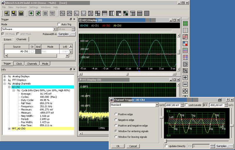 Il software SBench 6 permette di utilizzare immediatamente la schede di acquisizione in modalita oscilloscopio oppure in modalità registratore dati e integra già molte funzioni di analisi e manipolazione dei segnali.