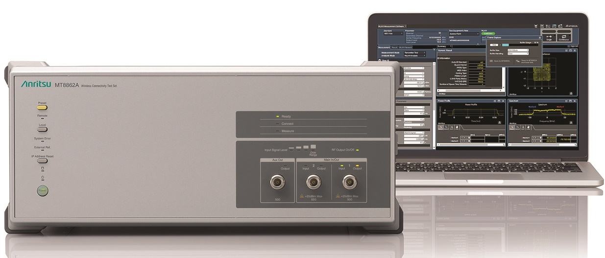 Il nuovo Wireless Connectivity Test Set MT8862A presentato da Anritsu è uno strumento con funzionalità e caratteristiche avanzate, tra cui protocolli di comunicazione integrati, che può essere usato per validare il funzionamento dei ricetrasmettitori WLAN durante la fase di progetto o in produzione.