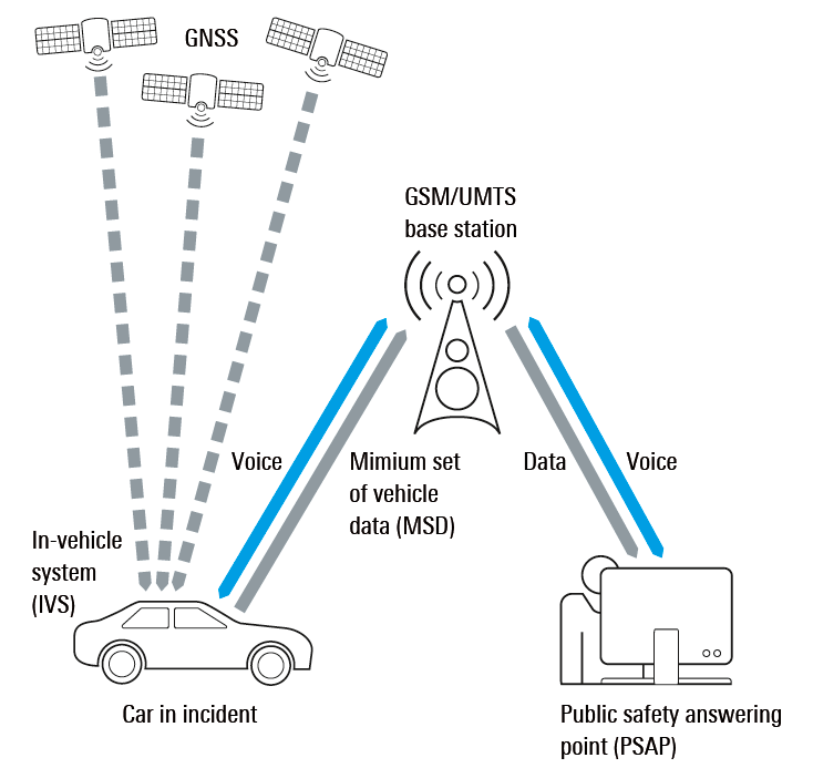 A partire dal 2015, in Europa sarà obbligatorio inserire in tutti i nuovi veicoli il sistema di chiamata automatica di soccorso (eCall), che sfrutta la localizzazione satellitare e la rete di comunicazione cellulare per inoltrare automaticamente al più appropriato centro di gestione delle emergenze una richiesta di aiuto.