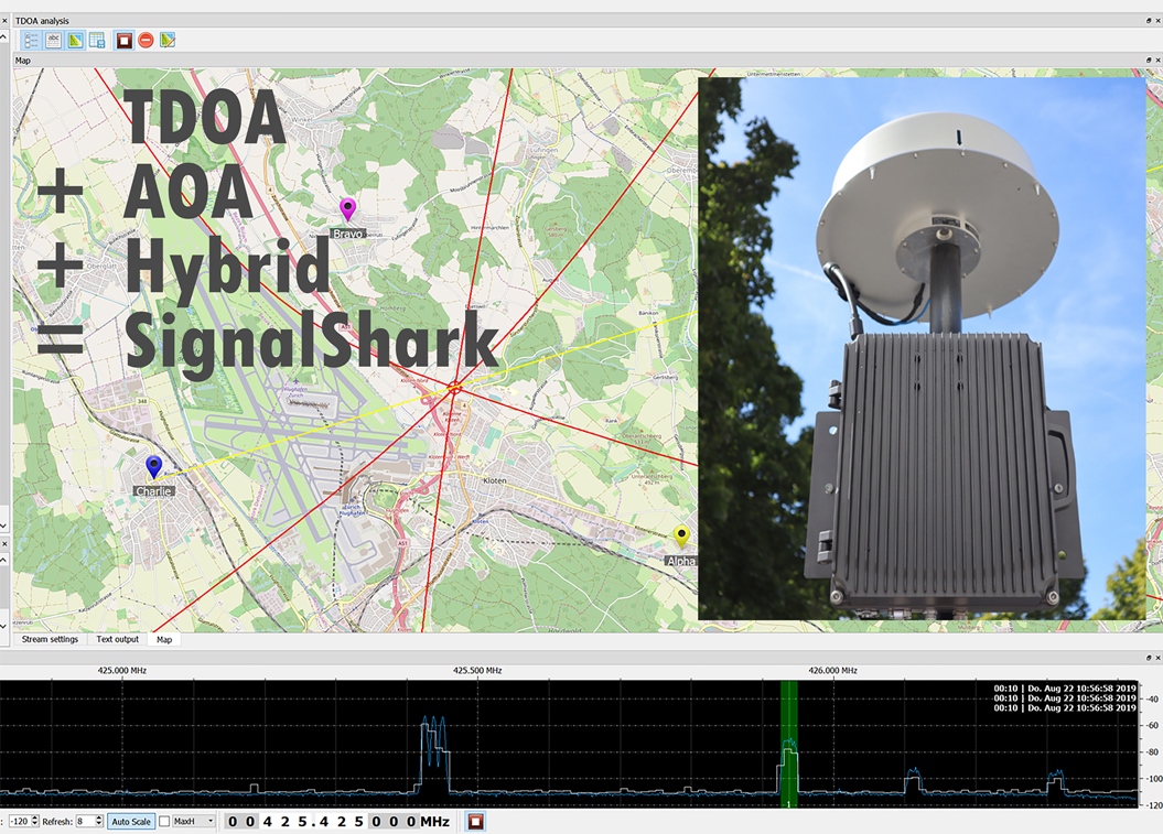 Il sistema SignalShark, con il suo ricevitore e l’antenna ADFA, supporta due metodi di localizzazione della direzione di provenienza dei segnali. Le sorgenti dei segnali rilevati possono essere localizzate in modo affidabile usando la tecnica TDOA (Time Difference of Arrival), basata sulla differenza del tempo di arrivo, oppure la tecnica AOA (Angle of Arrival) che rileva l’angolo di arrivo del segnale, ma anche una combinazione di entrambi i metodi (modalità ibrida).