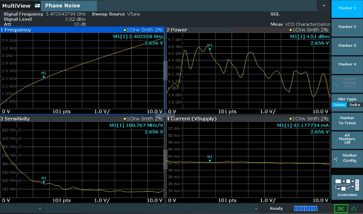 Le misure accurate sui VCO vengono realizzate sfruttando tre sorgenti DC a basso rumore. È possibile misurare oscillatori di tipo OCXO (termostabilizzati), DRO (risonatori ceramici) e VCO (controllati in tensione). Per facilitare il controllo remoto e l'automazione della produzione, è possibile registrare automaticamente sequenze di comandi SCPI.