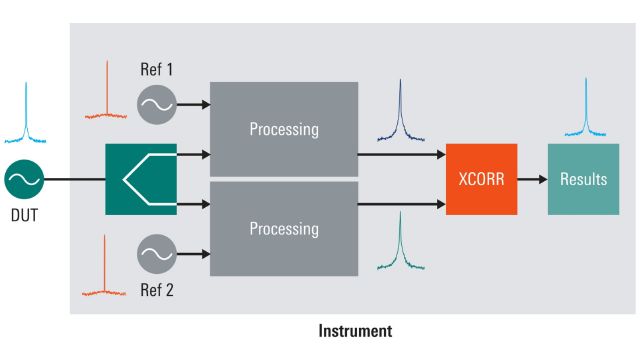Il metodo della cross-correlazione migliora sia la sensibilità che l'accuratezza delle misure del rumore di fase.L'eccellente sensibilità al rumore di fase dell'analizzatore R&S FSPN deriva dall’impiego di due oscillatori locali interni a basso rumore, che consentono di effettuare una cross-correlazione in tempo reale.