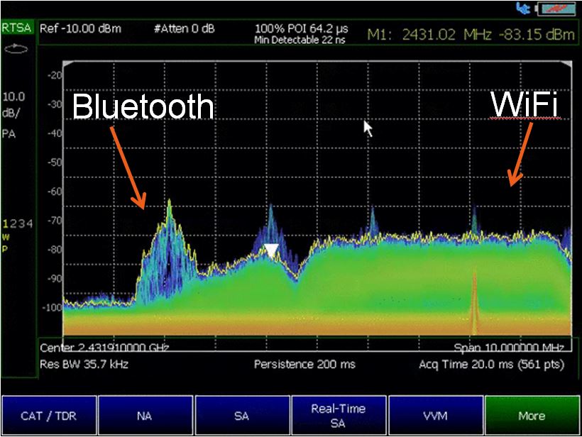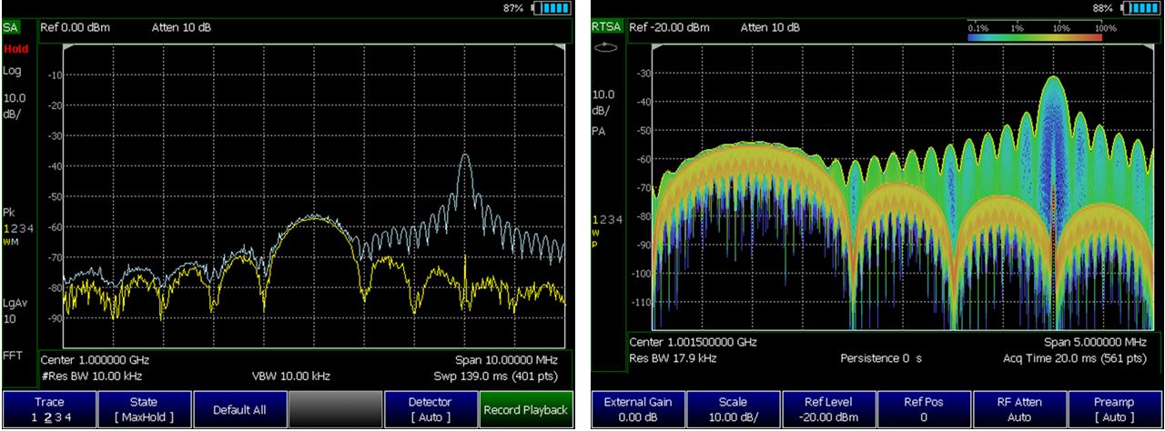 Nella figura sottostante si può apprezzare la ricchezza di informazioni ricavabili dall'analisi di spettro in tempo reale (a destra), con la densità di occorrenza nel tempo riprodotta tramite i colori, rispetto alla classica acquisizione a scansione in modalità 'max hold' di un segnale dove sono presenti molteplici impulsi.