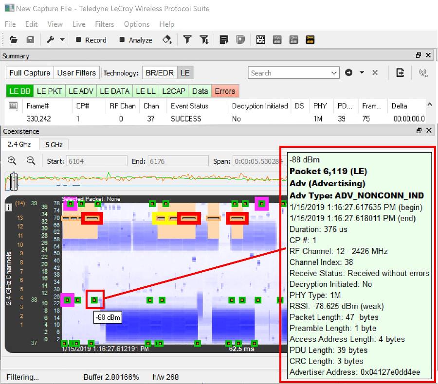 Wireless Protocol Suite facilita la verifica della coesistenza di più radio operanti nella stessa banda ISMLa potenza del segnale (RSSI) viene visualizzata quando l'utente passa il mouse sopra l'energia RF catturata. Con questi dati si può osservare in dettaglio come coesistono più tecnologie wireless nella modalità di visualizzazione Coesistenza.