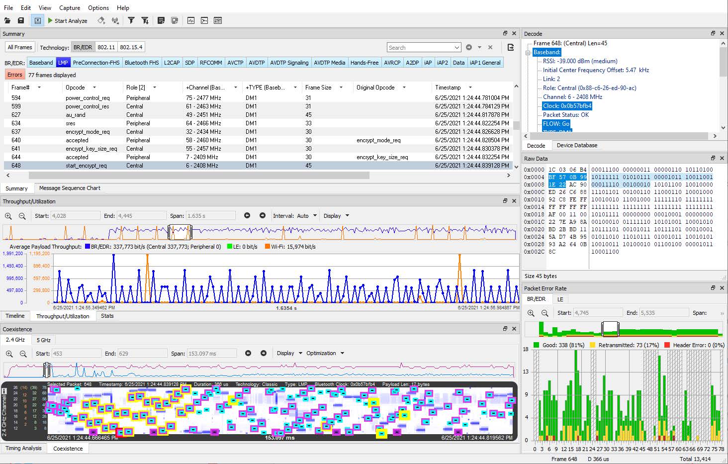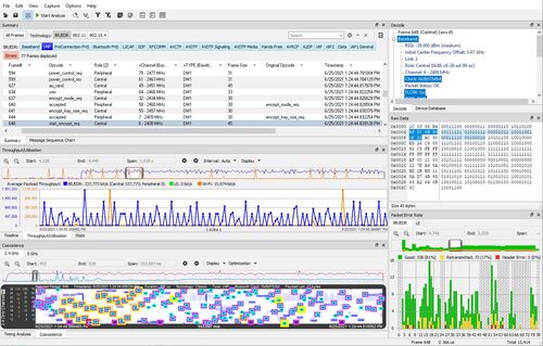 Le varie finestre disponibili comprendono un pannello di riepilogo, la decodifica dei pacchetti, i dati grezzi, la visualizzazione Coesistenza, l'analisi temporale dei segnali, il grafico di troughput e dei tassi di errore, l'occupazione dei canali radio e tante altre informazioni che a seconda delle attività da svolgere possono essere visualizzate o nascoste.