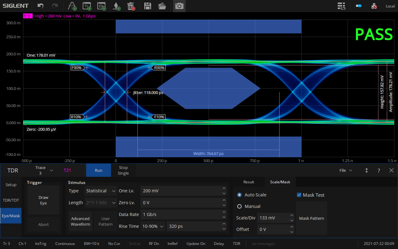Analisi del jitter con diagramma a occhio e maschera tramite l'opzione SNA5000-TDRLa combinazione di TDR e VNA consente anche l'analisi del jitter, essenziale per studiare la stabilità temporale dei segnali. Entrambe le funzioni sono di particolare interesse nello sviluppo di collegamenti seriali digitali ad alta velocità.