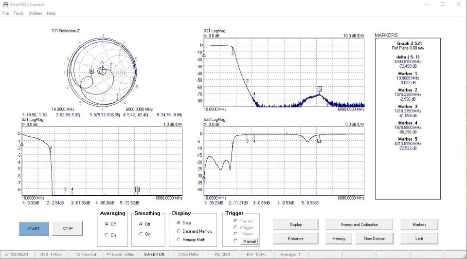 L'analizzatore PicoVNA 106 viene formito con un software per Windows che consente di disegnare i classici grafici relativi alle misure scalari o vettoriali per misura e una porta e due porte, oltre a salvare i dati in formato tabellare, compresno il formato Touchstone.