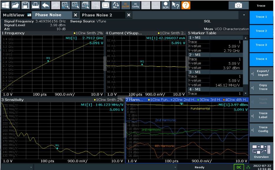 Caratterizzazione completa di un VCO: frequenza, potenza di uscita, pendenza di sintonizzazione e consumo di corrente in funzione della tensione di sintonizzazioneCon la nuova opzione R&S FSWP-B56G, Rohde & Schwarz ha esteso la gamma di frequenza per le misure del rumore di fase assoluto da 50 GHz a 56 GHz. Basta premere un pulsante, non è necessario alcun convertitore esterno.