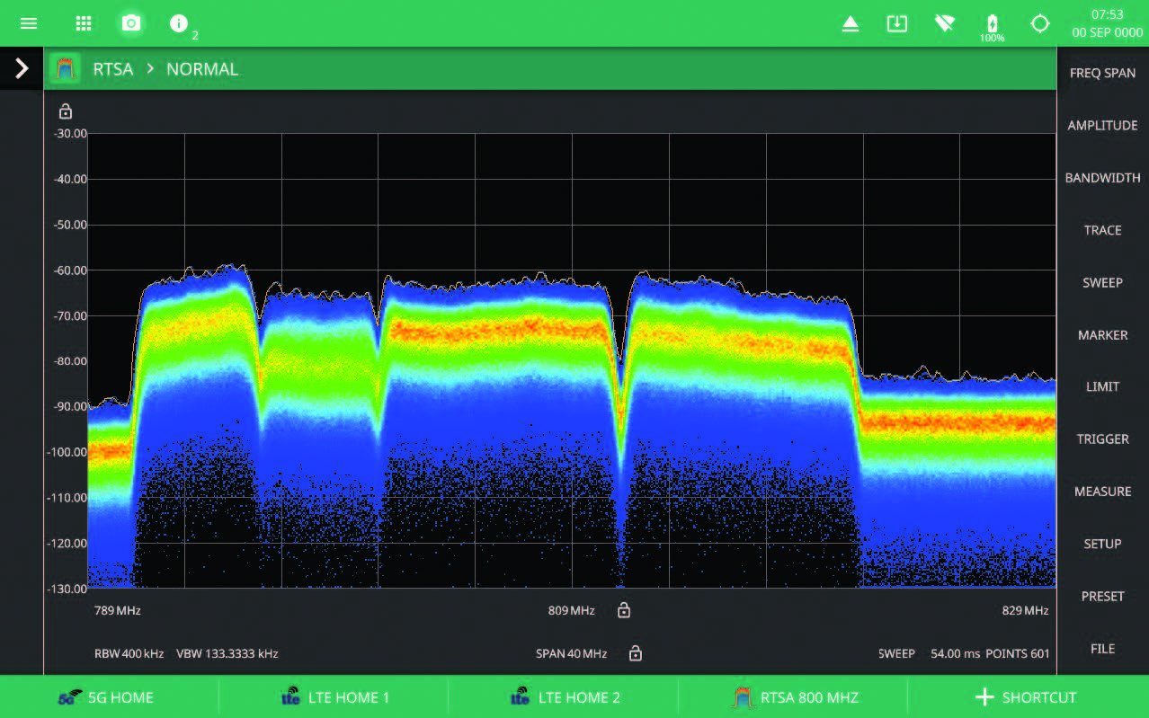 La funzione RTSA offre una larghezza di banda di analisi fino a 40 MHz e un rumore di fondo (DANL) di <-150 dBm, caratteristiche che rendono lo strumento adatto a catturare anche quei segnali intermittenti e modulati digitalmente che risultano spesso molto difficili da identificare.