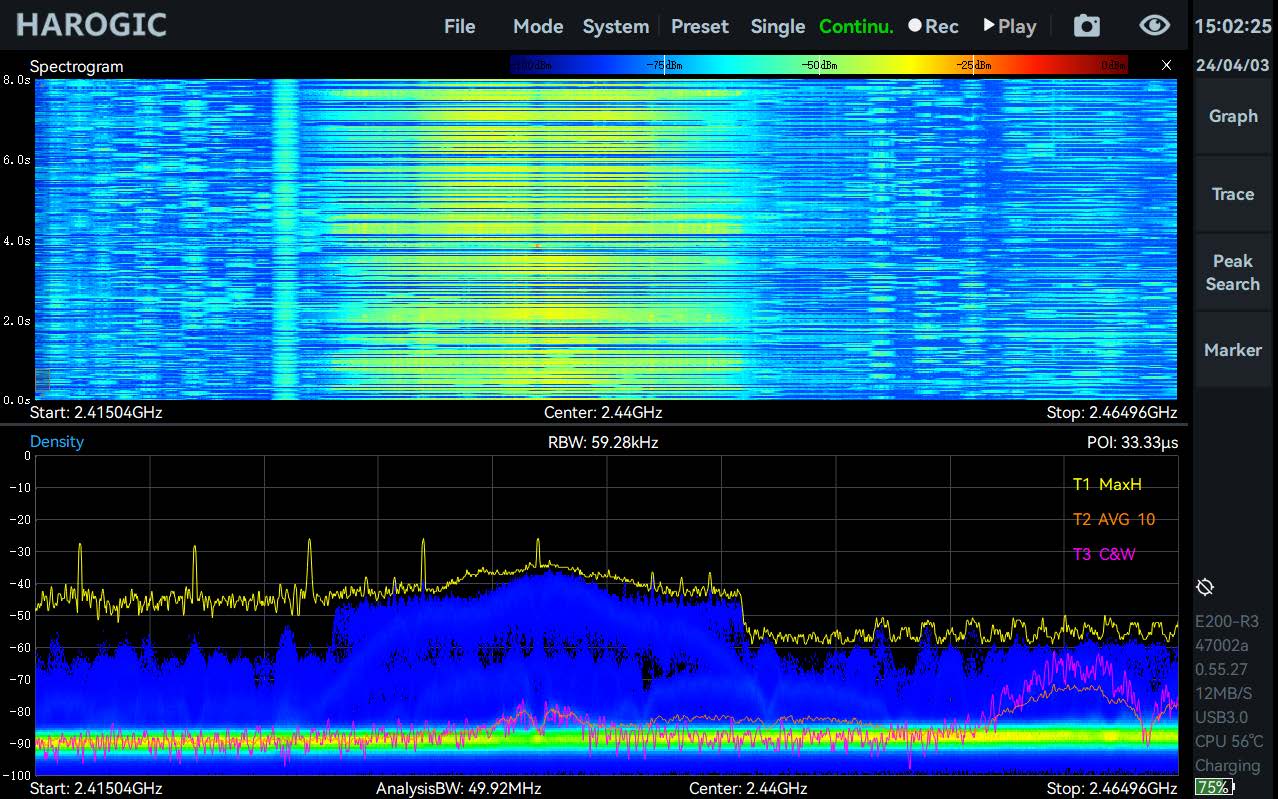 Lo strumento Harogic PXE-200 supporta anche la modalità di analisi dello spettro in tempo realeIl modello PXE-200 è un vero e proprio analizzatore di spettro in tempo reale da 20 GHz con una larghezza di banda di analisi 100 MHz e una velocità di scansione di 900 GHz/s, che offre la possibilità di scegliere tra le modalità di lavoro standard a scansione (SWP), streaming delle componenti di segnale IQ (IQS), zero span (DET) e analisi in tempo reale (RTA).