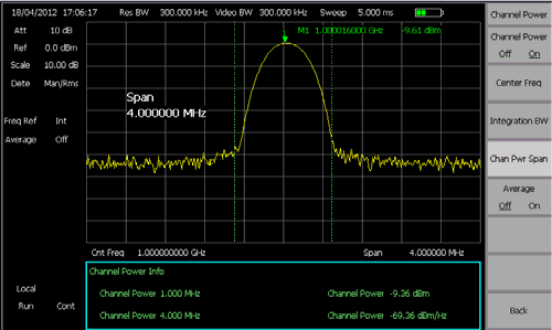 Misure automaticheLo strumento ha una velocità di misura elevata per questa classe di strumenti, di 600 ms su un intervallo di span di 18 GHz e sono presenti di serie diverse funzioni di misura automatiche, come la potenza nel canale, la potenza nel canale adiacente e altre.