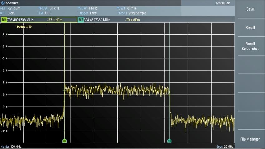 La combinazione di un basso fondo di rumore e di elevata potenza massima misurabile, fino a +30 dBm (1 W), consente di effettuare misura con una gamma dinamica straordinariamente ampia per uno strumento di questa classe di prezzo.