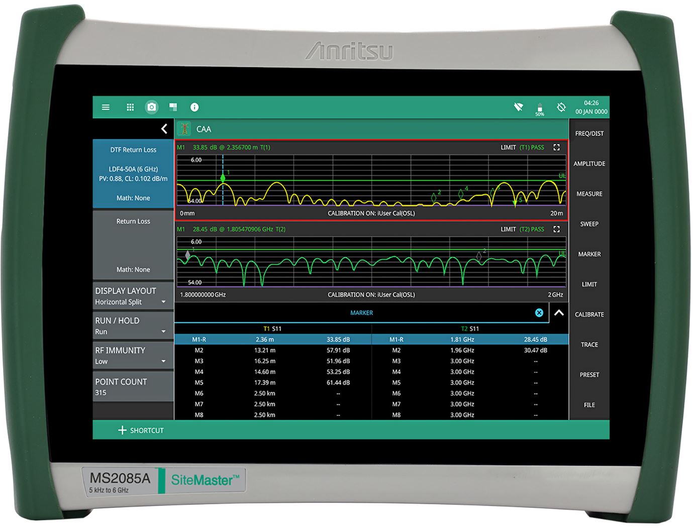 L'analizzatore di cavi e antenne di nuova generazione Anritsu MS2085A permette di effettuare tutte le misure tipiche sugli impianti ricetrasmittentiGli analizzatori Site Master MS2085A e MS2089A integrano le più moderne soluzioni tecnologiche per l'analisi dei segnali nello spettro di frequenze tra 5 kHz e 6 GHz.