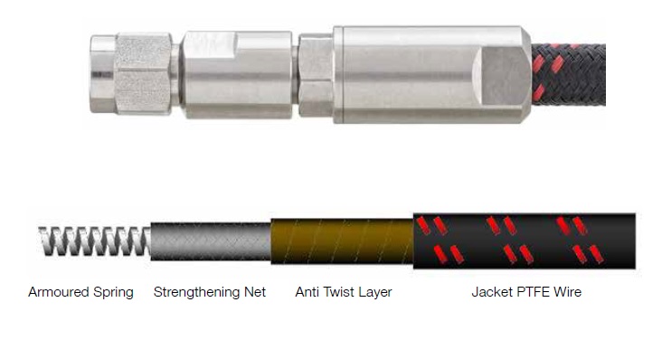 Tre le principali caratteristiche di questa nuova serie dicablaggi flessibili coassiali a microonde vi sono la disponibilità di cablaggi preassemblati per segnali fino a 70 GHz, elevata stabilità di fase, basse perdite di inserzione e di attenuazione, grande resistenza allo schiacciamento (fino a 1000N) con apposite armature, rivestimento di protezione piacevole al tatto, alta durata e flessibilità, tempi di consegna ridotti con la possibilità di richiedere personalizzazioni di lunghezza dei cavi e tipologia connettori.