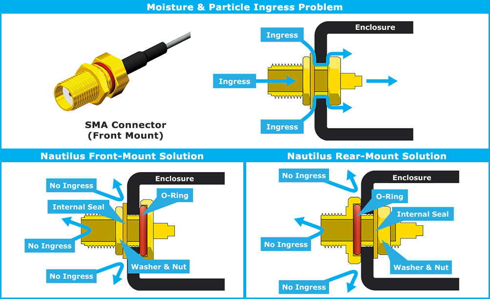 I vari modelli di connettori della famiglia Nautilus comprendono varianti in formato SMA con montaggio anteriore e posteriore, RP, TNC, RP-TNC e BNC. Inoltre, GradConn offre assemblaggi di cavi completi e collaudati per una grandissima varietà di connettori coassiali, in particolare per i connettori micro-coassiali come Hirose, Murata, I-Pex e Sunridge.