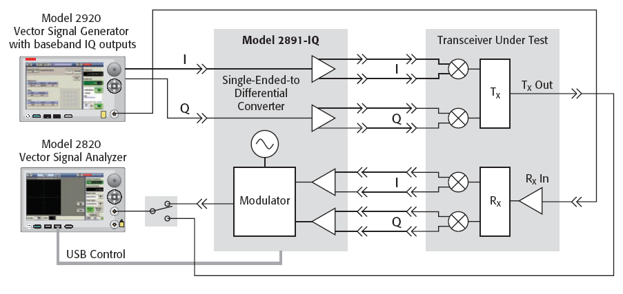 La combinazione tra il modello 2891-IQ, il generatore di segnali vettoriali modello 2920 e l'analizzatore di segnali vettoriali modello 2820A permette di creare un sistema per il collaudo di transceiver RF compatto, semplice ed economico.