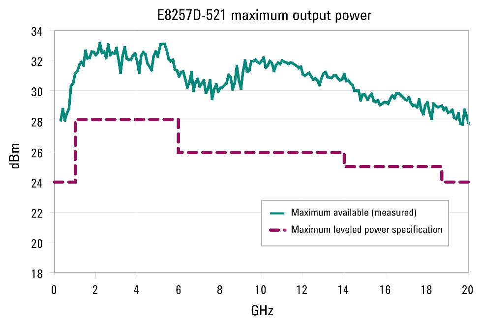 L’opzione 521 per il generatore di segnali Agilent PSG E8257D offre una potenza d’uscita specificata tra +24 e +28 dBm su una gamma di frequenze compresa tra 250 MHz a 20 GHz (usabile fino a un limite inferiore di 10 MHz) ed elimina la necessità di utilizzare hardware supplementare come amplificatori, accoppiatori e rilevatori.