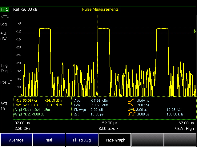 L'opzione di misura di segnali impulsivi sfrutta i misuratori di potenza di picco Agilent U202x (disponibili nelle versioni da 18 GHz e 40 GHz) per caratterizzare gli impulsi alla semplice pressione di un tasto, con la visualizzazione in chiaro di tutti i parametri chiave che caratterizzano il segnale.