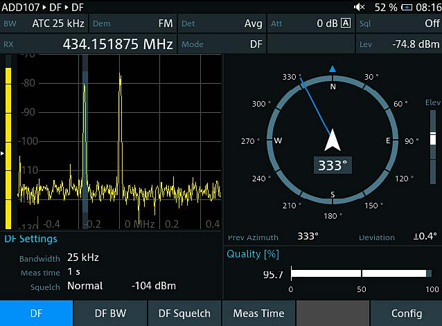 Il ricevitore è in grado di rilevare, analizzare e demodulare segnali con frequenze da 8 kHz a 8 GHz e può funzionare da radiogoniometro quando viene abbinato alle antenne DF compatte di Rohde & Schwarz operanti nella bande da 20 MHz a 6 GHz.