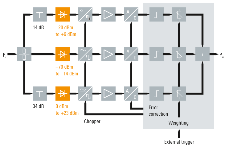 La struttura circuitale interna con tre cammini differenziati del segnale permette al sensore a diodo di misurare livelli di potenza anche molto bassi, sino a –70 dBm.