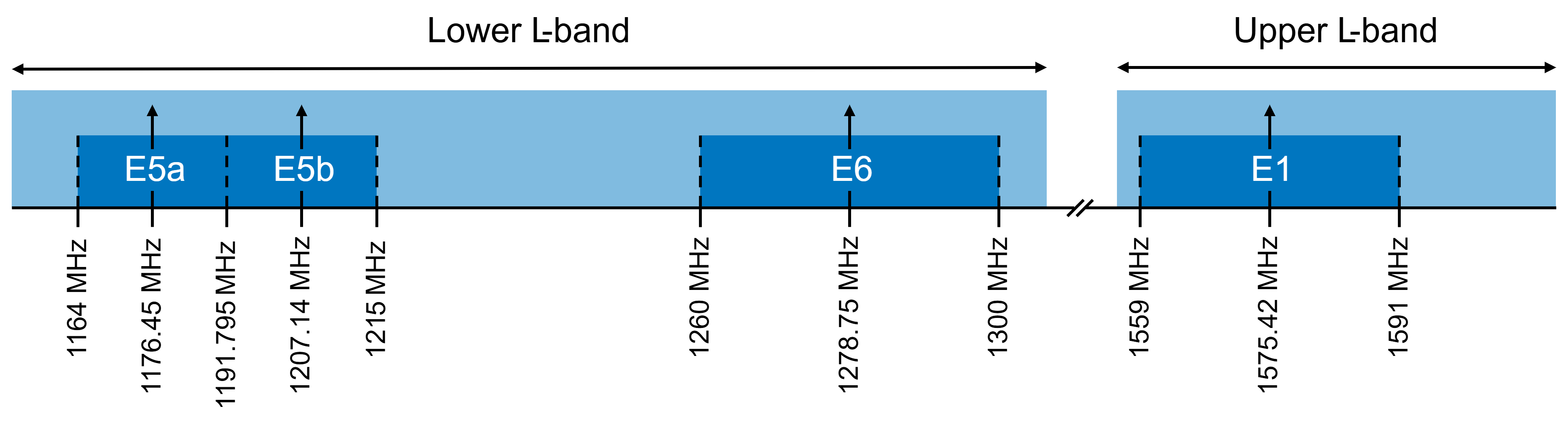 I collegamenti downlink sono solitamente assegnati alla parte inferiore di una banda, a causa della minore attenuazione atmosferica, mentre i collegamenti uplink occupano frequenze più elevate, per supportare velocità di trasmissione dati più elevate. Le definizioni delle sottobande variano a seconda del sistema; ad esempio, Galileo utilizza le designazioni “E” all'interno della banda L invece della nomenclatura “L” utilizzata da altre costellazioni GNSS.