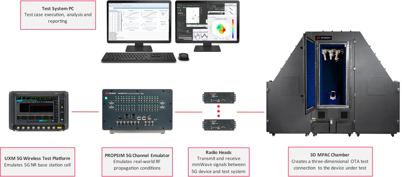 La nuova soluzione proposta da Keysight per effettuare queste tipologie di prova sui dispositivi reali comprende l'emulatore di canale radio PROPSIM FS16 o F64, la piattaforma di test wireless UXM 5G e la camera anecoica multisonde per misura in modalità OTA in 3D.
