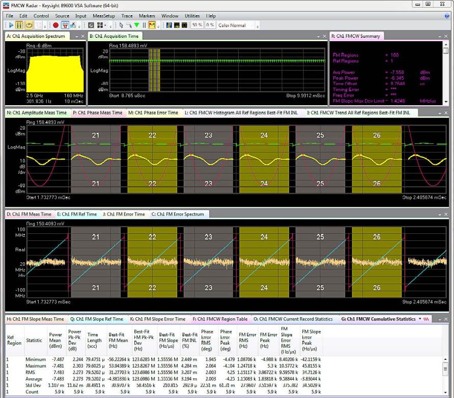 Allo stesso modo, per facilitare l'analisi dei segnali radar acquisiti, è possibile sfruttare il celeberrimo pacchetto software per l'analisi dei segnali vettoriali Keysight 89600 VSA equipaggiato con l'opzione BHP dedicata alla modulazione FMCW, che permette di sincronizzare i segnali in modo automatico nel dominio del tempo e della frequenza, calcolare misure automatiche, effettuare analisi statistiche e creare istogrammi e diagrammi di tendenza di parametri significativi dei fenomeni di proprio interesse.
