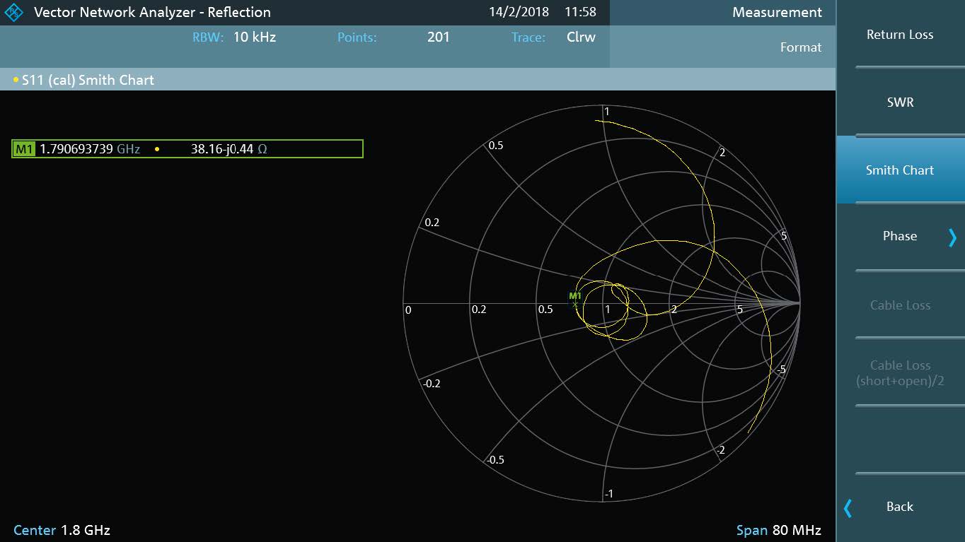 Grazie al ponte di misura interno, lo strumento R&S FPC1500 permette ad esempio di eseguire tutte le più comuni misure di riflessione (S11) su reti e antenne, misurarne l'impedenza o ricavarne la carta di Smith.