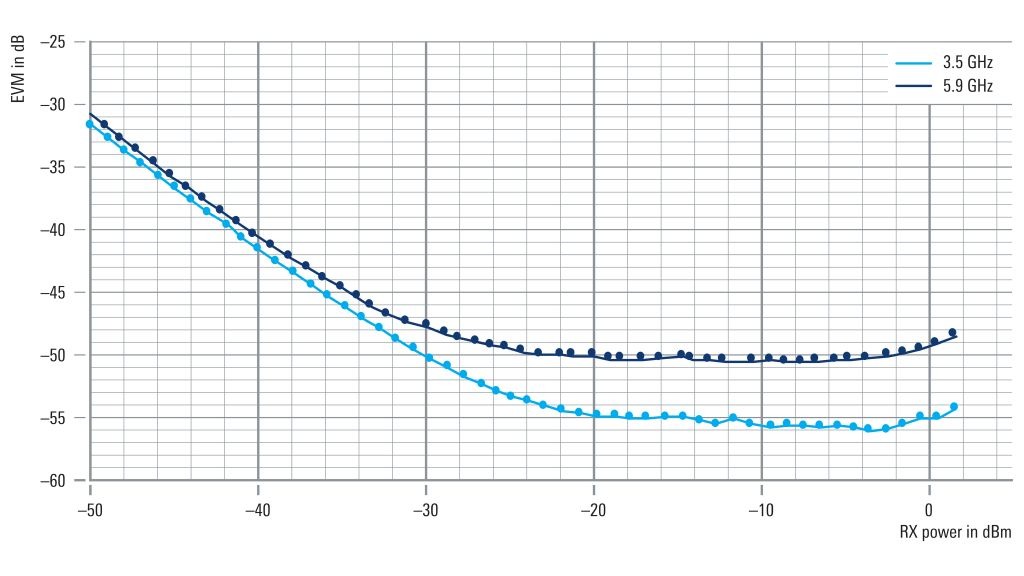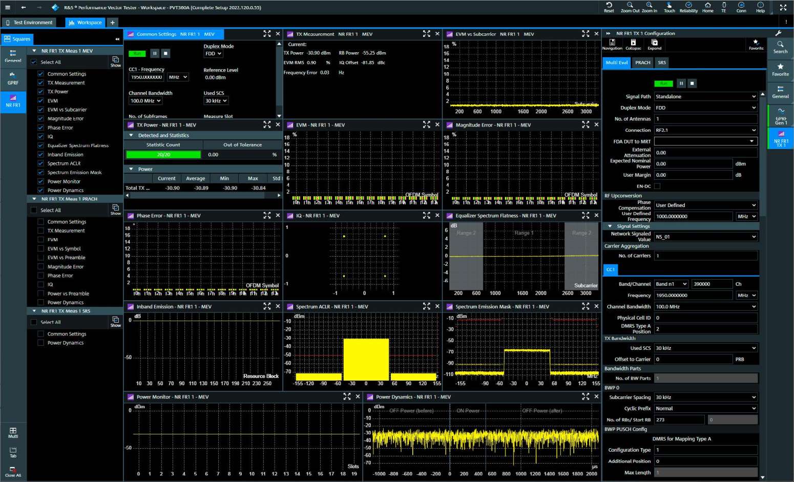 La larghezza di banda di analisi massima del segnale di 500 MHz supera di gran lunga il massimo di 100 MHz previsto dallo standard 5G FR1 e soddisfa anche i criteri di misura relativi ai test di emissioni fuori banda (out of band emissions) e quelli sui canali adiacenti (ACLR).