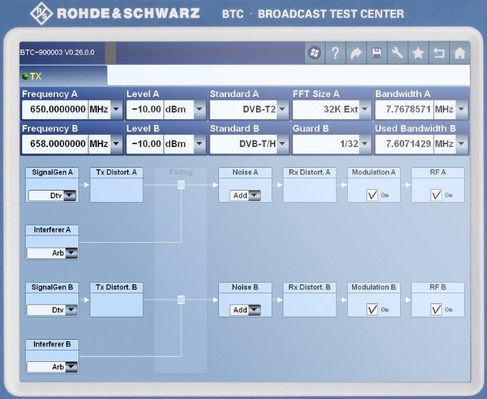 Le prove tipiche per la valutazione e certificazione di apparati riceventi prevedono la verifica del loro comportamento in varie condizioni realistiche soggette e interferenze e propagazione non ottimale. Per affrontare queste misure, la piattaforma R&S BTC mette e disposizione fino a otto generatori di forme d'onda arbitrarie abbinabili al cammino del segnale RF, oltre ai due canali di elaborazione RF in tempo reale indipendenti.