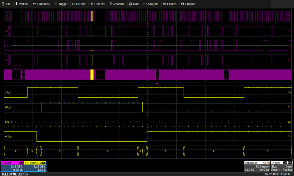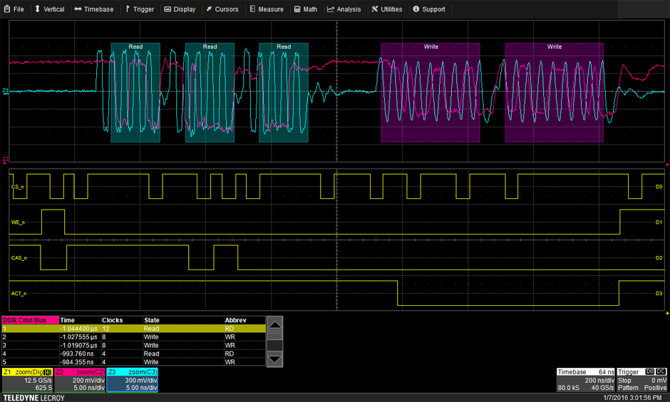 Grazie allo strumento HDA125, il bus dei comandi delle memorie DDR acquisito ed integrato direttamente nello strumento di analisi analisi, con la possibilità di abilitare sofisticate capacità di trigger e sistemi di ricerca dello stato del bus.