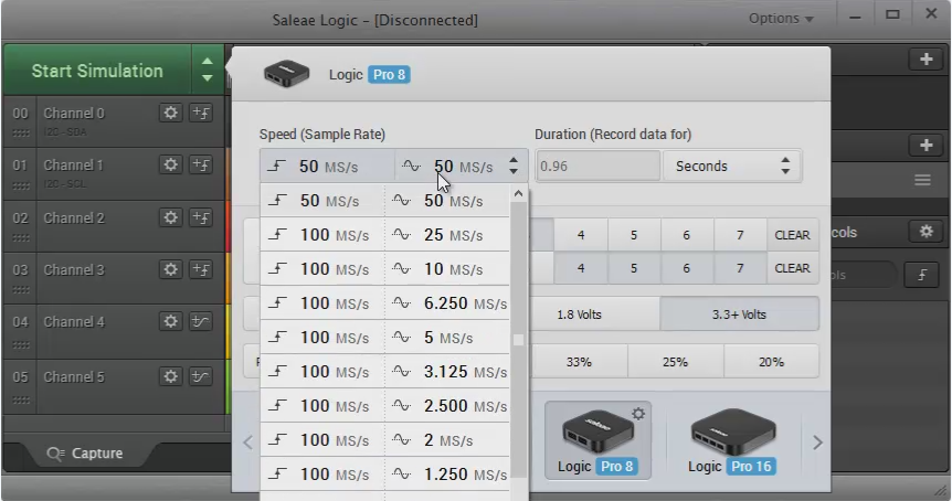 Utilizzando il modello di punta collegato al PC con un'interfaccia USB 3.0, la velocità di acquisizione massima sui canali digitali è di 500 Ms/s (fino a 4 contemporaneamente) oppure di 100 Ms/s (su tutti e 16 i canali), mentre per i canali analogici è di 50 Ms/s (su 3 canali) e di 6,26 Ms/s (su tutti e 16 canali).